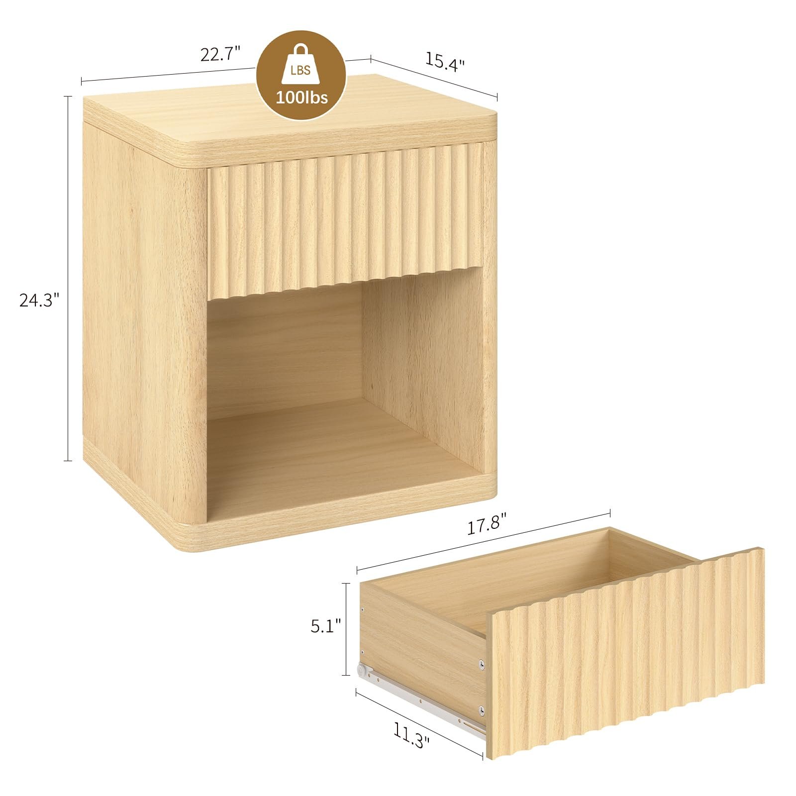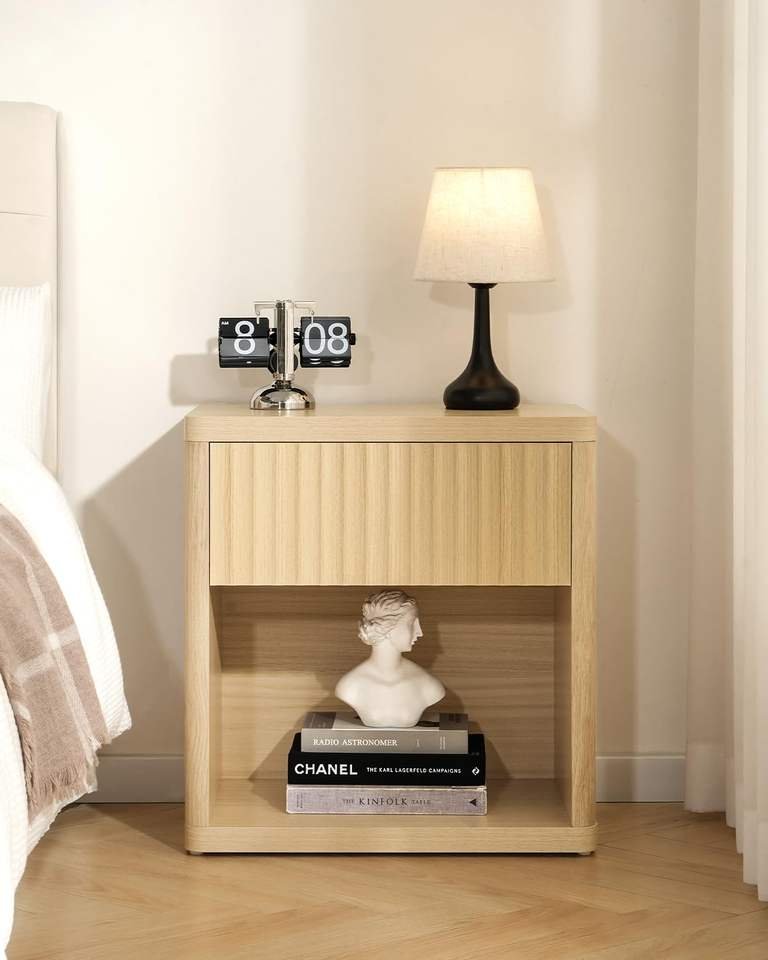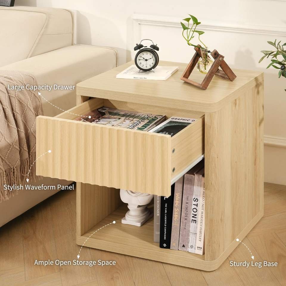 Bed Edge Modern Wooden Nightstand with Wave Panel Drawer & Open Shelf