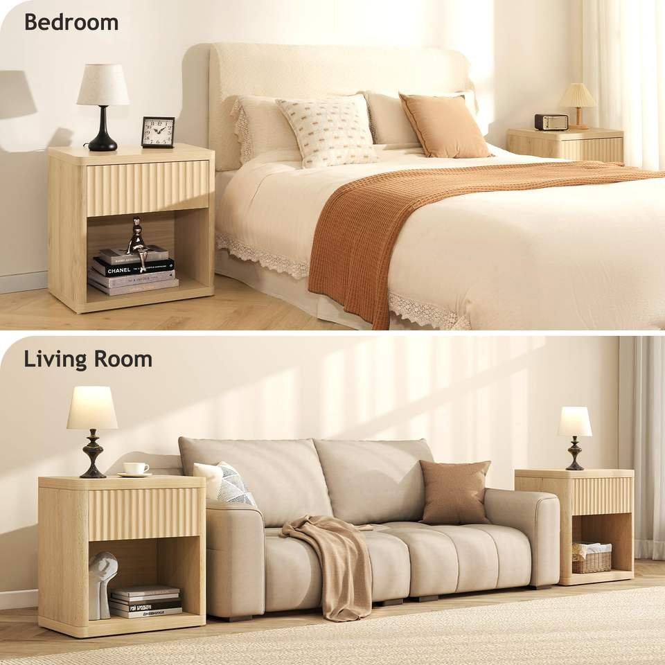 Bed Edge Modern Wooden Nightstand with Wave Panel Drawer & Open Shelf
